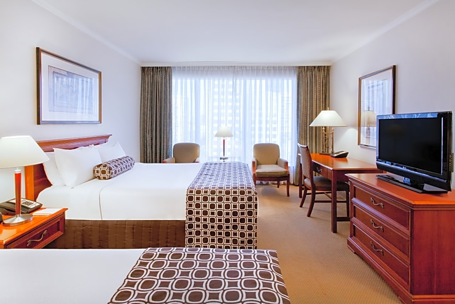 Experience the comfort of our spacious Classic Queen Room with a stunning city view, featuring two queen beds and a private bathroom with a relaxing bathtub. Indulge in our air-conditioned retreat, perfect for 2 adults and 1 child.